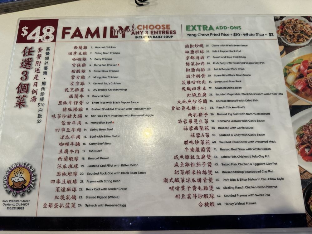 Introducing the menu at Shooting Star Cafe, located in Oakland, CA, offers an extensive selection of delicious dishes ranging from sandwiches like BLT and Club to soups such as Clam Chowder and Hot & Sour Soup. The appetizers include Fried Calamari Rings and Popcorn Chicken, providing a diverse range of options for every palate. Customer reviews highlight the flavorful Curry Beef Brisket with rice as a must-try dish, while the baked pork chop receives mixed feedback. The cafe also serves refreshing milk tea and crispy egg puffs, adding to the overall dining experience. With a casual yet classy atmosphere, Shooting Star Cafe is a great spot for breakfast, brunch, or late-night cravings. Don't miss out on their tasty offerings and friendly service next time you're in the area.